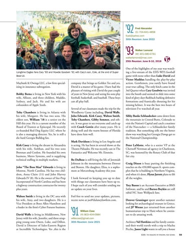 company that brings us Golden Tee and yes, David is a master of his game. I have had the pleasure of visiting with David the past couple of years in New Jersey and seeing his sons play football, basketball, and baseball. These boys can all play ball. Several of our classmates made the trip for the Woodberry Game including, David Wafle, John Edwards, Kirk Casey, Walton Smith, Toby Chambers, Gibby Semmes, and others. It was great to see everyone and catch up with Coach Gowin after many years. He is doing well and the warm breezes of Florida have done him well. Mark Davidson is living in Los Angeles and is acting. He has been in several shows at the Theatre Palisades. He was recently cast in The Fantastics and Welcome Mr. Einstein. Bo DuBose is still living the life of Jeremiah Johnson in the mountains between Denver and Boston. His daughter, Eliza, is a sophomore at Mercersburg Academy this year. I look forward to keeping you up to date with things our classmates have been up to. I hope each of you will consider sending me an update on your lives. Feel free to send me your updates, pictures, recent news at joe@dulaneylawfirm.com.