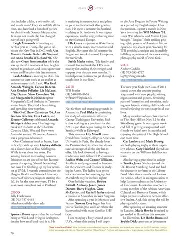 The new year finds the Class of 2011 spread across the country getting acquainted with new people, joining organizations and groups, becoming parts of fraternities and sororities, making new friends, visiting old friends, and overall enjoying the next stage in all our lives. Many members of our class returned to The Holy Hill on Nov. 12 for the Woodberry game. It was a great weekend full of getting reacquainted with friends we hadn’t seen in months and enjoying the spirit of The High School one more time. Cat Lambert and Mark Herzog are both playing rugby at their respective schools. Cary Hairfield played last semester on the Williams field hockey team. Also having a great time in college is Tamika Jones. She has joined the UC Bearcat Marching Band and had the chance to perform in the Liberty Bowl. She’s also a member of Latinos En Accion, which is an organization to help Latino students at the University of Cincinnati. Tamika has also been a strong member of the African-American Cultural and Resource Center, which helps prepare students to become effective leaders. And, this spring she will be playing club lacrosse. After spending an amazing semester in London, Maria Hewko is excited to get settled at Hamilton this semester. In December, Liz Heebe-Russo and Sophie Dick came out as debutantes