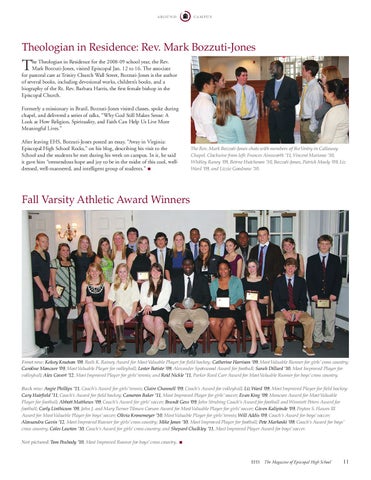 he Theologian in Residence for the 2008-09 school year, the Rev. Mark Bozzuti-Jones, visited Episcopal Jan. 12 to 16. The associate for pastoral care at Trinity Church Wall Street, Bozzuti-Jones is the author of several books, including devotional works, children’s books, and a biography of the Rt. Rev. Barbara Harris, the first female bishop in the Episcopal Church. Formerly a missionary in Brazil, Bozzuti-Jones visited classes, spoke during chapel, and delivered a series of talks, “Why God Still Makes Sense: A Look at How Religion, Spirituality, and Faith Can Help Us Live More Meaningful Lives.” After leaving EHS, Bozzuti-Jones posted an essay, “Away in Virginia: Episcopal High School Rocks,” on his blog, describing his visit to the School and the students he met during his week on campus. In it, he said it gave him “tremendous hope and joy to be in the midst of this cool, welldressed, well-mannered, and intelligent group of students.” n