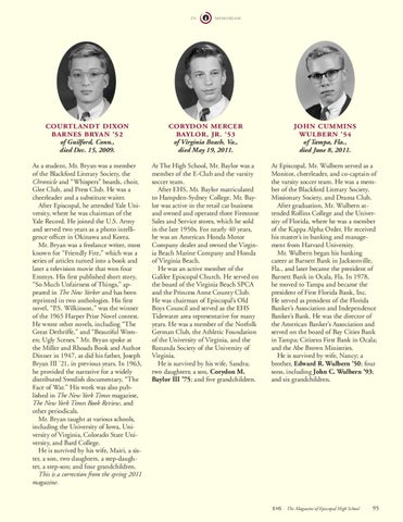 As a student, Mr. Bryan was a member of the Blackford Literary Society, the Chronicle and “Whispers” boards, choir, Glee Club, and Press Club. He was a cheerleader and a substitute waiter. After Episcopal, he attended Yale University, where he was chairman of the Yale Record. He joined the U.S. Army and served two years as a photo intelligence officer in Okinawa and Korea. Mr. Bryan was a freelance writer, most known for “Friendly Fire,” which was a series of articles turned into a book and later a television movie that won four Emmys. His first published short story, “So Much Unfairness of Things,” appeared in The New Yorker and has been reprinted in two anthologies. His first novel, “P.S. Wilkinson,” was the winner of the 1965 Harper Prize Novel contest. He wrote other novels, including “The Great Dethriffe,” and “Beautiful Women; Ugly Scenes.” Mr. Bryan spoke at the Miller and Rhoads Book and Author Dinner in 1947, as did his father, Joseph Bryan III ’21, in previous years. In 1963, he provided the narrative for a widely distributed Swedish documentary, “The Face of War.” His work was also published in The New York Times magazine, The New York Times Book Review, and other periodicals. Mr. Bryan taught at various schools, including the University of Iowa, University of Virginia, Colorado State University, and Bard College. He is survived by his wife, Mairi, a sister, a son, two daughters, a step-daughter, a step-son; and four grandchildren. This is a correction from the spring 2011 magazine.