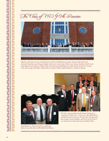The Class of 1973 gathered in the Alumni Cottage for a reception on Friday, Nov. 8. Front row: Marshall Ellison and Bob Prevatt; second row: Woody Coley, Tom Harrison, Ross Lampe, George VanMeter, and Porter Farrell; third row: David Carr, John Townsend, and Billy Peebles. Paul Mengel ’73, Porter Farrell ’73, and Easley Johnson ’73 at the Spirit of The High School Dinner.