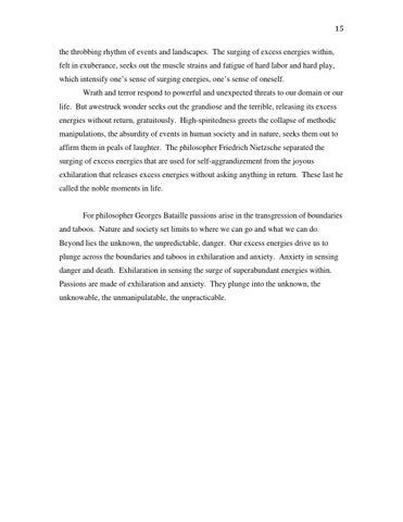 felt in exuberance, seeks out the muscle strains and fatigue of hard labor and hard play, which intensify one’s sense of surging energies, one’s sense of oneself. Wrath and terror respond to powerful and unexpected threats to our domain or our life. But awestruck wonder seeks out the grandiose and the terrible, releasing its excess energies without return, gratuitously. High-spiritedness greets the collapse of methodic manipulations, the absurdity of events in human society and in nature, seeks them out to affirm them in peals of laughter. The philosopher Friedrich Nietzsche separated the surging of excess energies that are used for self-aggrandizement from the joyous exhilaration that releases excess energies without asking anything in return. These last he called the noble moments in life.
