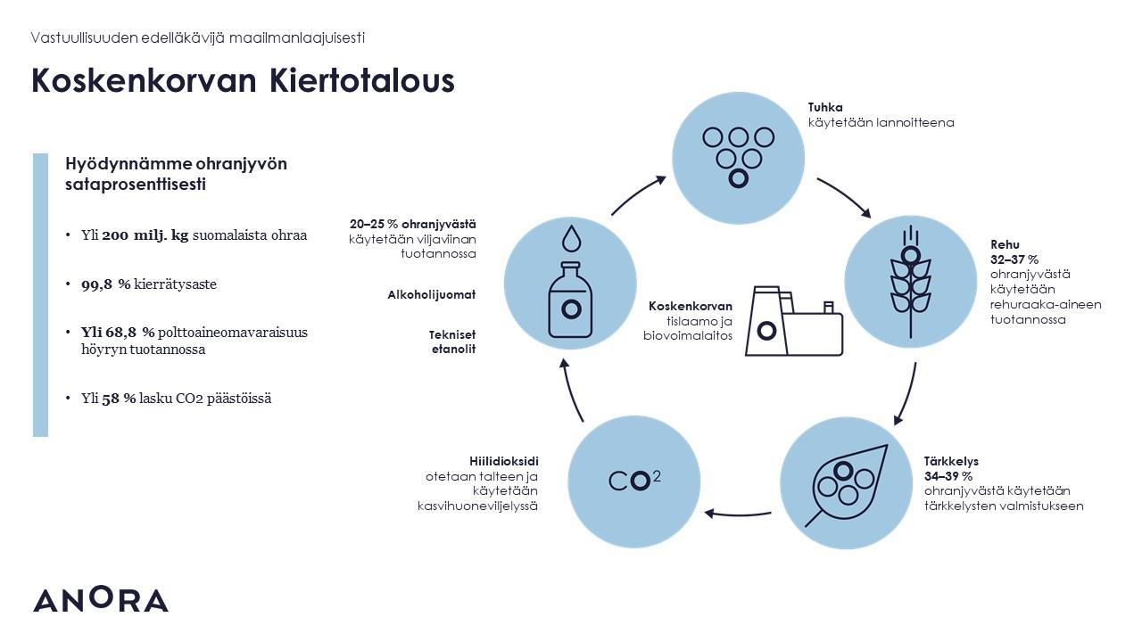 neen eli viljan maksimaalinen hyödyntäminen. Luonnontuotteena vilja uusiutuu joka vuosi ja sen kuori käytetään uusiutuvana polttoaineena. Jäljelle jäävää tuhkaa käytetään lannoitteena pellolla mahdollistaen jälleen uuden kasvin kasvamisen ja uuden sadon. Monipolttoaineratkaisuihin panostetaan. Ohrasta valmistetaan tärkkelystä, rehuraaka-aineita ja ensisijaisesti juomaetanolia, mutta myös muita etanolijakeita, jotka sopivat teknisiksi tuotteiksi. Ne, mitä ei voi käyttää, hyödynnetään energiana. Eri polttotekniikat edellyttävät lisähintaa investoinneissa, mutta pitkässä juoksussa ne ovat olleet järkeviä ratkaisuja. Erityisesti näitä aiempia päätöksiä arvostaa maailman nykytilanteessa, kun ei olla riippuvaisia esimerkiksi maakaasusta.