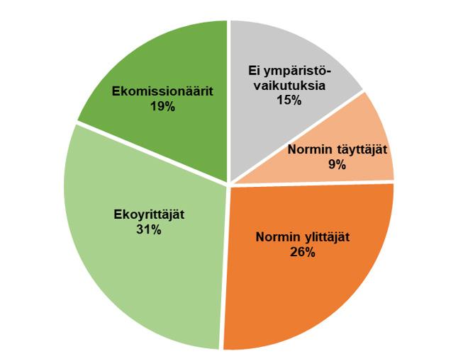 Jopa puolet vastanneista yrityksistä kuului joko ekoyrittäjiin tai ekomissionääreihin. Ekoyrittäjät ovat yrityksiä, jotka etsivät aktiivisesti uusia liiketoimintamahdollisuuksia vihreästä siirtymästä