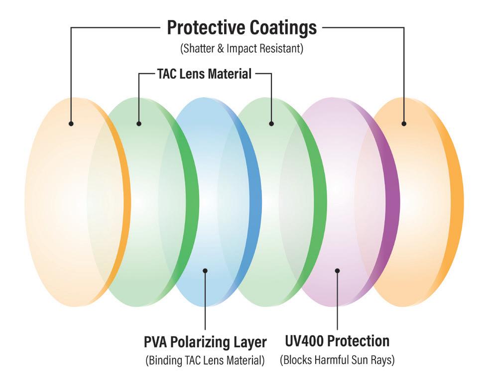 The process for creating tac lenses includes adding several layers to the lens of the sunglasses, all of which add various levels of protection.
