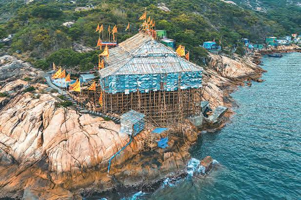 戲棚雖是臨時建築,卻承載著不臨時的 情感。每年天后誕,島上的冷清一掃而空, 從香港各區、甚至遠至海外的村民,都會返 鄉團聚,一同觀神功戲、上香酬神、敘舊懷 舊,場面熱鬧又溫馨。對村民而言,這是家 的記號;對搭棚師傅而言,則是一份責任與 使命,承諾只要身體還撐得住,就會繼續 搭,為村民服務。這座建於懸崖之上的戲 棚,不僅是技藝的體現,更是一種連結,一 段情誼的延續。◇