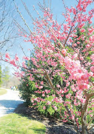 布魯克林植物園的一大特色便是 這座有百年歷史的日式園林,置身其 中就像是來到了一幅水墨畫中,落花 點水,氣韻清幽。裏面栽種的垂櫻輕 盈而富有生命力,巨大的枝幹像是畫 中濃墨行筆的遊龍,青青綠苔為其增 添了幾分不經意的柔軟;纖細的枝條 上綴滿粉嫩的小花,隨風舞動,像是 對寒冬的揮別。站在樹下感覺空氣都 變得溫柔了幾分,滿眼的粉白與若隱 若現的花香是對東方含蓄之美恰到好 處的詮釋。