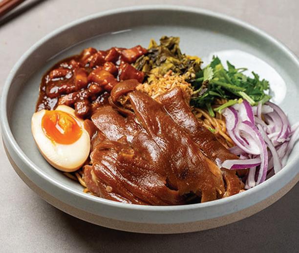 「甜香撈麵汁」為自家研發,以甜醬油為 基底,混合自家滷水汁與鍊油,再融入滷肉 燥,烹調出層次豐富的撈麵汁,再搭配特調醃 酸菜,顧客可選擇手工寬麵條或鮮油麵,以及 多款主食。