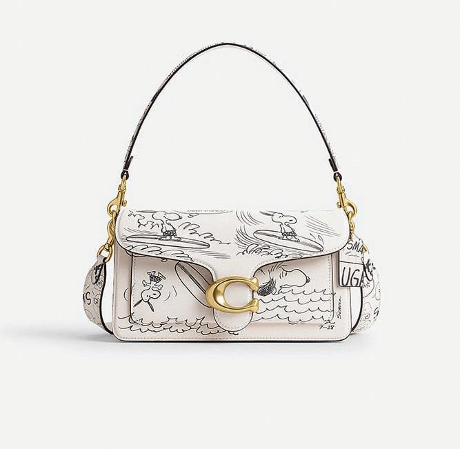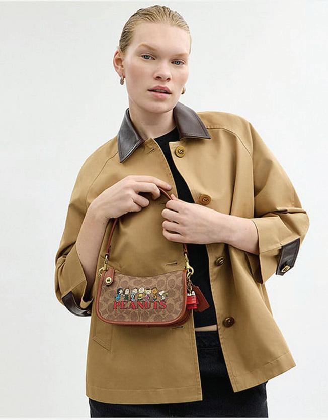 於各式的皮革單品上,Coach 把報紙印刷的 復古質感與 Peanuts 的卡通形象塑造出強大視覺反 差,既富懷舊又增添了一抹俏皮感。Tabby 手袋、 Rogue 手袋以及銀包單品分為粉筆白及榛果兩種色 調——粉筆白的冷調啞光底色如同是黑白漫面中 的「畫布」,鮮明地凸顯 Peanuts 角色的輪廓,並 展現出原稿的筆觸以及報紙印刷的歷史感。榛果 色皮革紋理和泛黃的報紙質感相輔相承,讓印在 其中的漫畫圖案更有復古氛圍,同時透出幽默感。