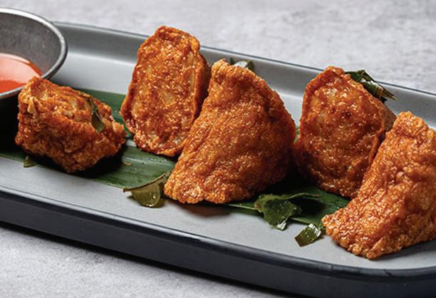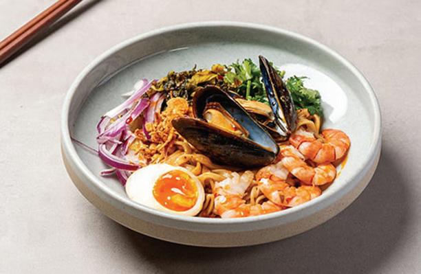 另一款同樣是自家研發的「惹味辣撈麵 汁」,以泰國調配的冬蔭功醬汁為核心,混合 魚露與鮮青檸汁,加入自家滷肉燥和特調醃酸 菜,搭配泰國直運的鮮幼粉。