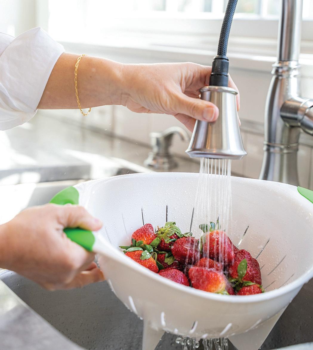 1. 將士多啤梨放入濾水籃裏,用冷水沖 洗士多啤梨幾秒鐘,要確保每顆士多啤梨都 有洗到。