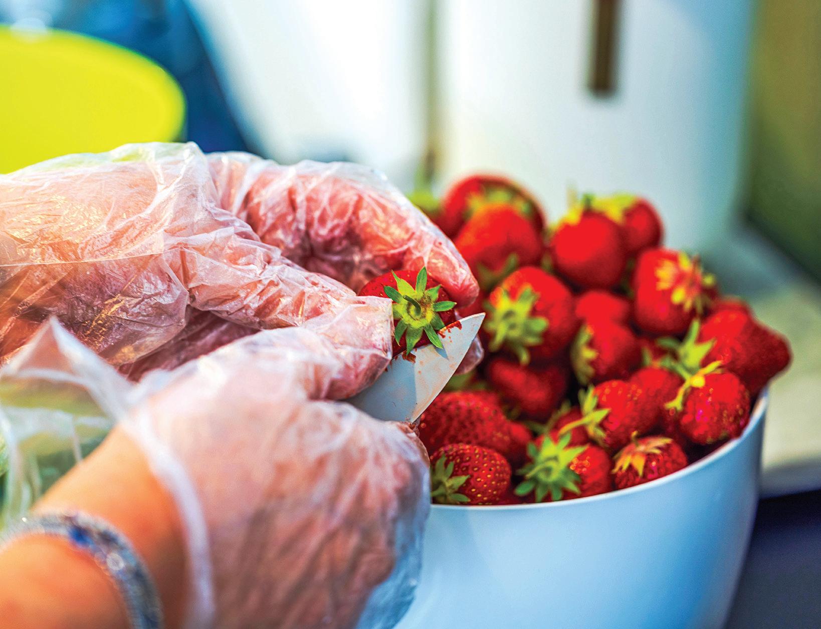 1. 接觸任何食物之前請先洗手,確保你 的手是乾淨的,才不會將細菌轉移到食物 上。按照美國食品藥物管理局的建議,處理 莓果之前,先用肥皂和水洗手至少 20 秒,這 樣可降低清洗食物的過程中交叉污染的風險。 2. 丟棄所有發霉或有損傷的士多啤梨, 因為食用這些士多啤梨可能導致生病。而且 如果將發霉的士多啤梨留在保鮮盒中,還可 能讓其它原本新鮮的士多啤梨也發霉。
