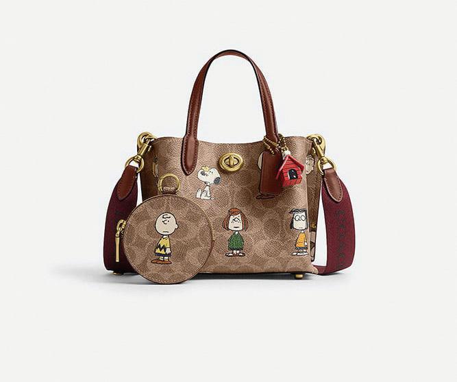 Coach x Peanuts 經典 Signature 印花 Willow 18 帆布托特手袋(棕褐焦糖色)。