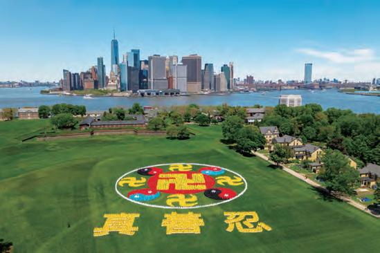 在總督島排字最為壯觀的一次 是 2019 年 5 月 18 日,約五千名來自 世界各地的法輪功學員在草地上排列 出巨型「法輪圖形」以及「真、善、 忍」三個中文大字。 5,000 多人不需事 先綵排,憑著高度的自律,有序排出 美麗的圖形,在藍天下的綠地閃耀著 和平的光芒,背景是曼哈頓的高樓大 廈,在這自由之島熠熠生輝。
