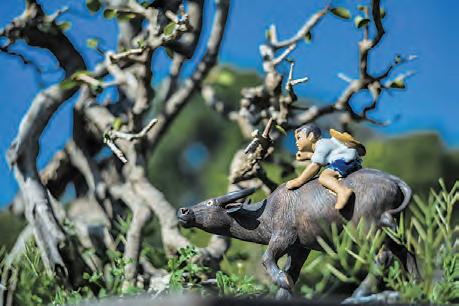 負責人鄭先生是香港盆栽會委員,帶着我 們遊覽此地。「石苑」佔地 5 萬平方尺,從正 門進入後便看見一個花園,內有小橋流水,鯉 魚暢泳,很有詩意,花園也充滿着嶺南派的園 景特色,是非常配合盆栽會內的數百盆嶺南派 的盆景,山水盆景互相輝映,絕配! 最初以為都是門前園景和遠處一間屋子, 經過圓拱門後又另一美景。數百盆盆景陳列 着,有大有小,也有不同石景。石景配盆景, 各有各特色,在嶺南派的盆景,都是着重自然 原生的樹縮小在一個小盆內,縮龍成寸,將這 原樹的美態濃縮並展露無遺。在這裏看到另一 位師傅全神貫注地對盆栽進行整理,他是盆栽 會的凌略老師,他也分享栽種盆景的心得,小 弟感覺到就像培養一個人成材似的,盡十分努 力,但又未必定會成功,要學會拿得起,放得 低,過程要積極,但結果又不能太過奢望,那 才活得充實又快樂!