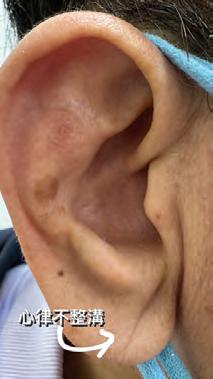 耳垂處有一條接近垂直的皺褶,稱為心律不 整溝,也稱為冠心溝、緊張溝或壓力溝。長期處 於壓力下或患有心律不整、心臟病的人,通常會