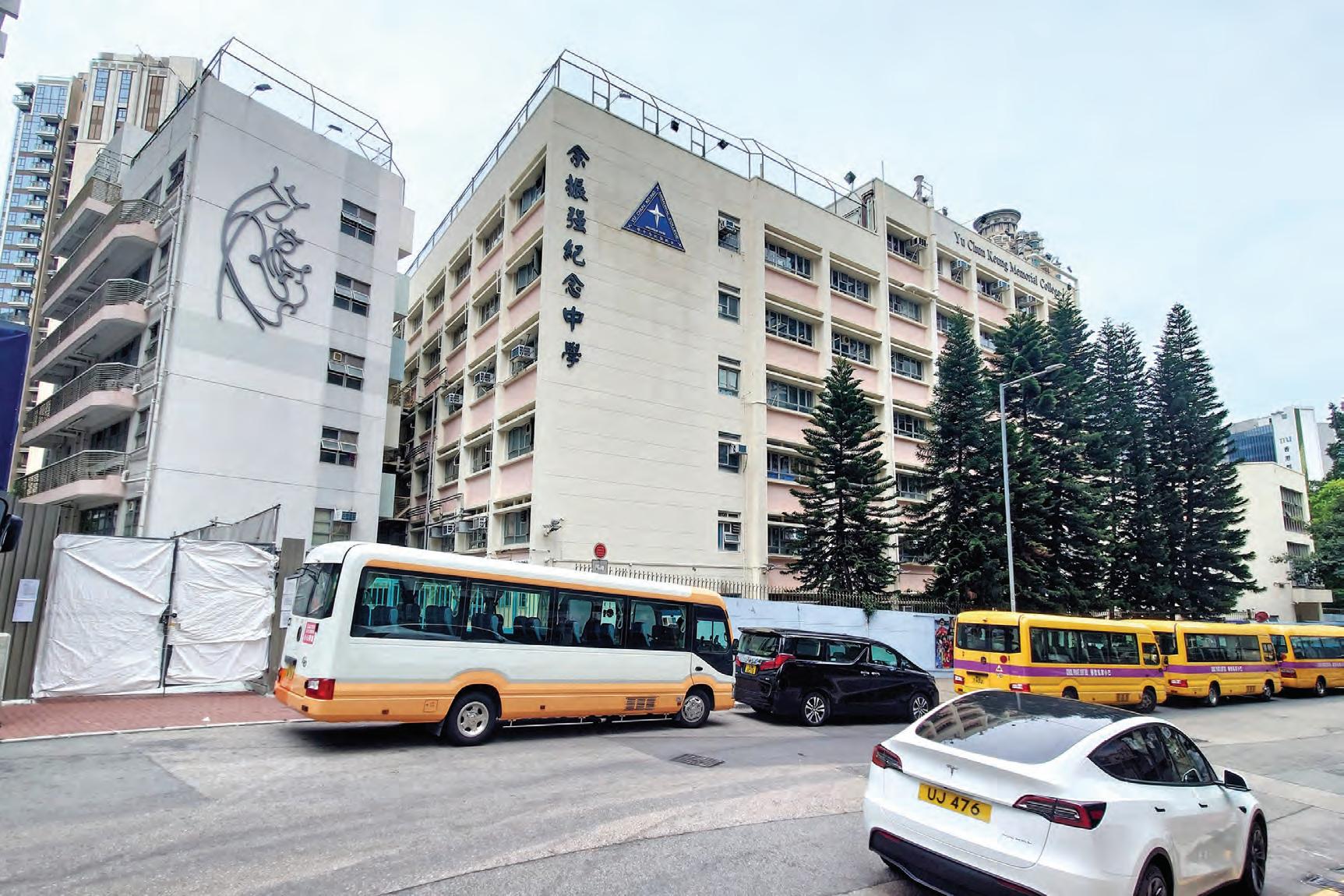 余振強紀念中學與香港史丹福美國學校只有一牆之 隔,攝於 2025 年。