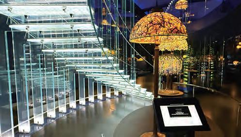 在兩層樓高的藝廊中,132 盞燦 爛奪目的蒂芙尼燈交錯擺放,在天花 懸掛、於桌面安放、從地面升起,配 合柔和的照明設計,將玻璃的光彩映 照得栩栩如生。最令人印象深刻的展 館設計,就是在兩層樓之間的玻璃螺 旋樓梯,不僅讓獨一無二的蒂芙尼燈 藝術品得以最充份的展示,在二層的 憑欄處,還以舊照片回放的方式,講 述蒂芙尼燈的由來,捐贈藏品的收藏 家故事,以及昔日王后區一家工廠手 工製作燈飾的歷史,並設有互動裝置 給參觀者體驗自己設計蒂芙尼燈顏色 的樂趣。