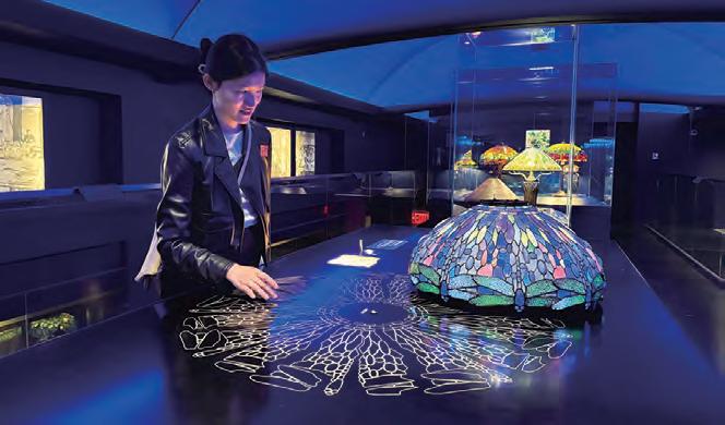 蒂芙尼燈藝廊的互動裝置展示玻璃工藝,參觀者可以體驗配色設計專屬蒂芙尼燈。