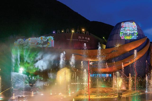 海洋公園「大熊貓生日特別版『光影盛夜』」 在晚上登場,「加加」和「得得」的大型光雕投 影,加上水幕特效和舞動噴泉,在輕快樂章襯托 下,幻光點亮夜空。