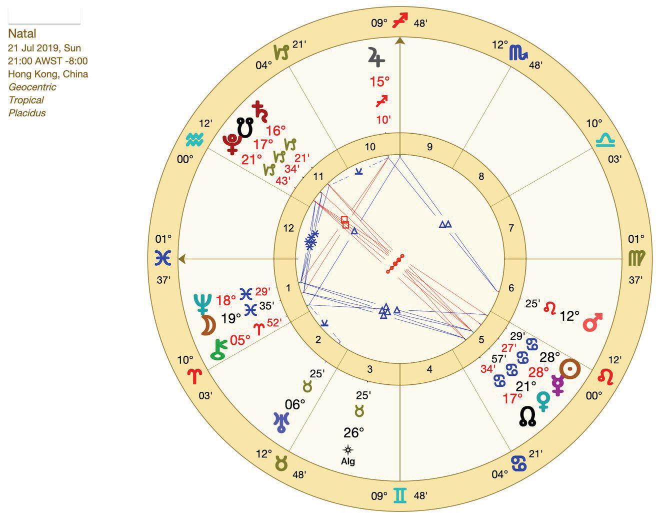 本事件蘊含強烈的混亂、隱瞞與欺騙能量, 並牽涉部份市民不顧自身安危、自我犧牲。此一 能量特質由上升雙魚及第一宮海王星與月亮雙魚 的合相所體現,凱龍星位於白羊亦揭示了傷痛與 犧牲的印記。事件所引發的暴力進一步帶來創 傷,這些能量不僅體現在社會層面,更衝擊司法 理念(海王星與月亮對第十宮木星形成困難相 位;凱龍星與天頂人馬呈流暢相位)。