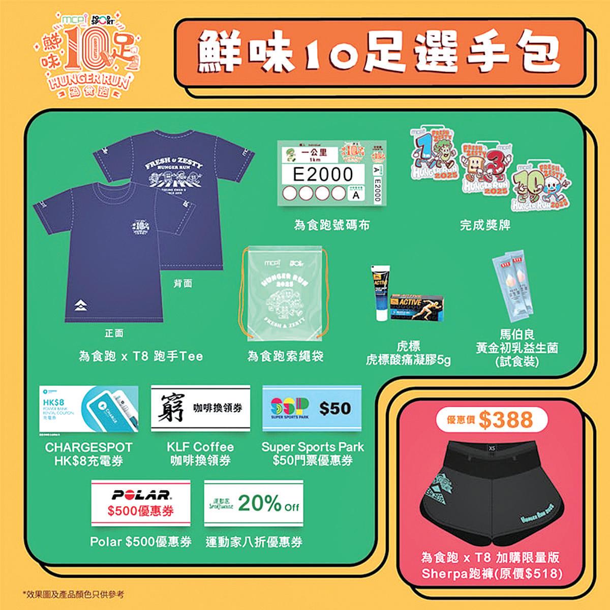 為紀念十周年,大會特別設計 以「鮮味 10 足」為主題的選手包 及完成獎牌。每位參加者將會獲得 由大會指定運動服裝 T8 品牌贊助 之 FOODSPORT 輕量跑步 Tee 件(價值港幣 443 元)。跑手們更 可用優惠價港幣 388 元加購限量版 「FOODSPORT x T8 Sherpa 跑褲」 (原價港幣 518 元)。同時選手包更 包含各式現金券、「鮮味 10 足」主 題設計的完成獎牌及號碼布扣等。 還有「全場最扮嘢大獎」讓各位參 加者們發揮創意,為活動增添歡樂 氣氛。