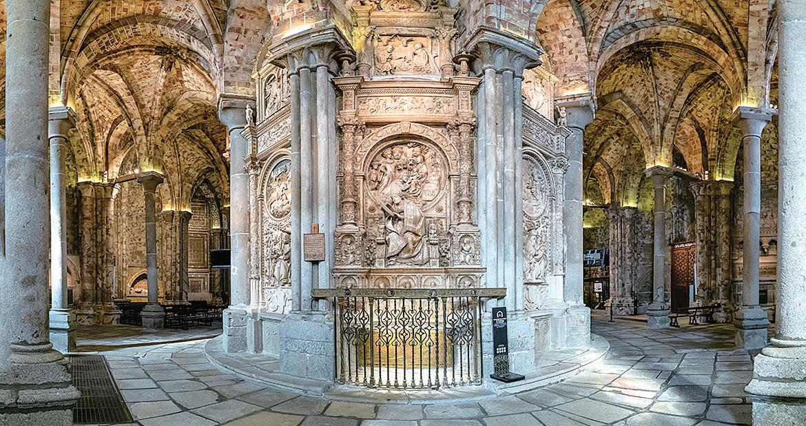 耳堂部份的裝飾則出自不同的藝術大 師之手,包括雕塑家 Vasco de la Zarza 創作的雪花石膏祭壇、洗禮盆與廊拱 (譯注 2)面板浮雕,以及佛蘭德斯雕 刻家 Cornielles de Holanda 雕製的胡桃 木唱詩班長椅,皆完成於 16 世紀上半 葉。