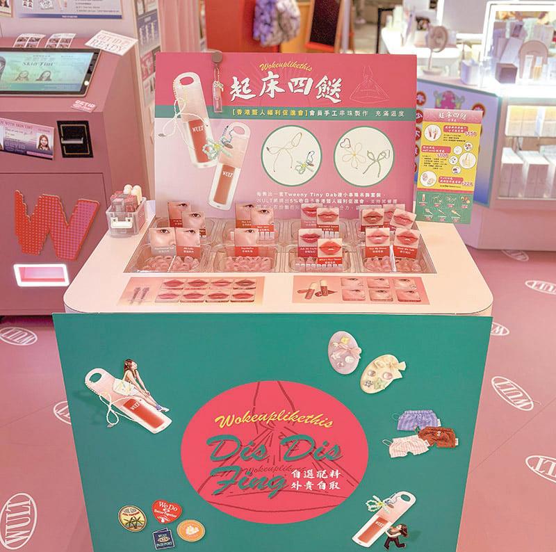 Tweeny Tiny Dab 迷你彩妝品,套裝中可 從 10 款迷你唇蜜及 7 款迷你液態胭脂,多達 17 款當中選擇心水產品。上方圓形環設計特 別,可用作掛飾或當配件,讓產品變身個人化 飾品,兼具實用與裝飾性,可自由選擇悄悄小 花吊飾或神秘低調小蝴蝶結吊飾。每顆串珠吊 飾均由香港聾人福利促進會的會員手工用心串 珠製作。每售出一套,WULT 將捐出 5% 收益 予香港聾人福利促進會,支持其營運開支。在