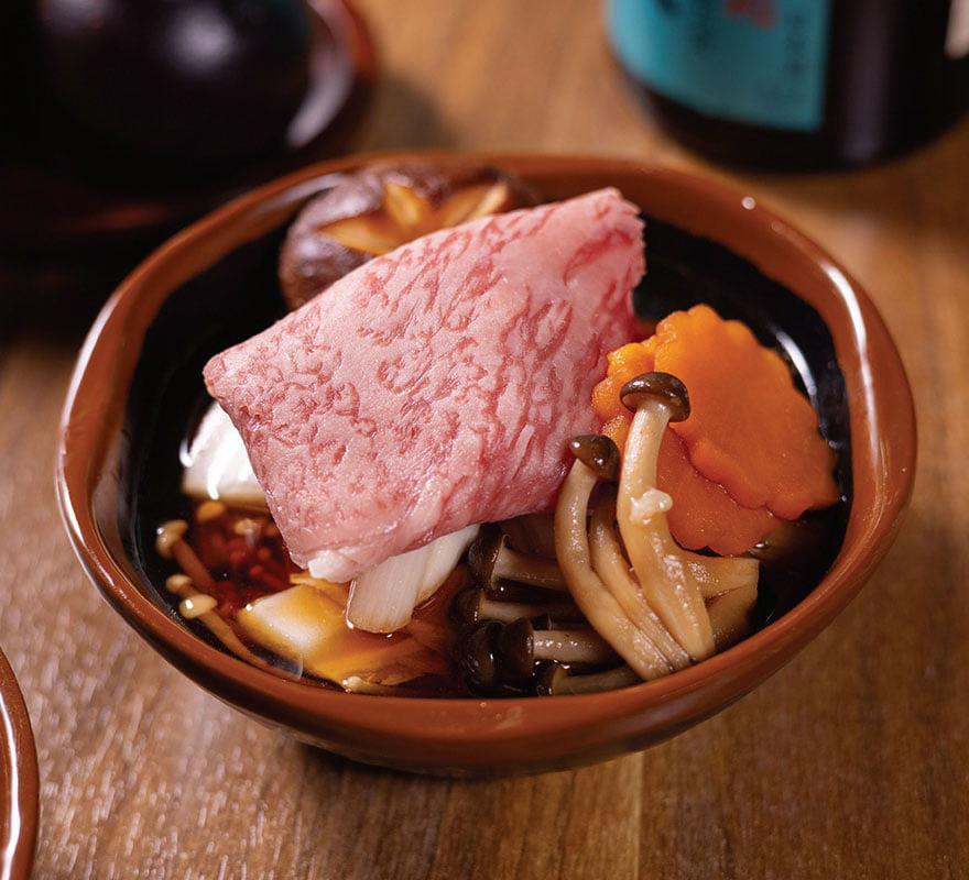放題採用頂級日本食材。其中,嚴選日本 A5 宮崎和牛牛肩,中級油花分布猶如「雪花霜 降」,提供火焰和牛壽司、壽喜燒、配牛角包等 多款食法。宮崎和牛海膽牛角包選用外層金黃酥 脆的法式牛角包,A5 宮崎和牛「牛眼蓋」表面經 過輕輕火炙,逼出豐腴油脂,再疊新鮮海膽,與 三文魚籽,加上秘製醬汁,將海膽的甘甜、和牛 的油香與魚籽的鮮味融合。