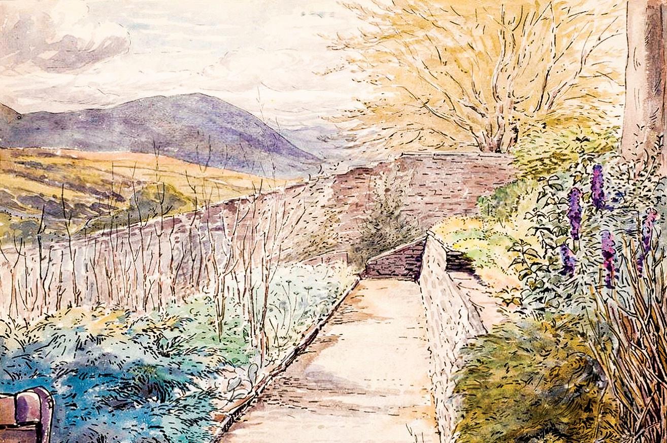 碧雅翠絲波特繪製的這座圍牆花園,位於薩弗里的伊斯懷客(Ees Wyke, Sawrey),約