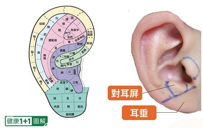 集中於兩個部位——對耳屏(代表腦部)和 耳垂(代表頭面部)。