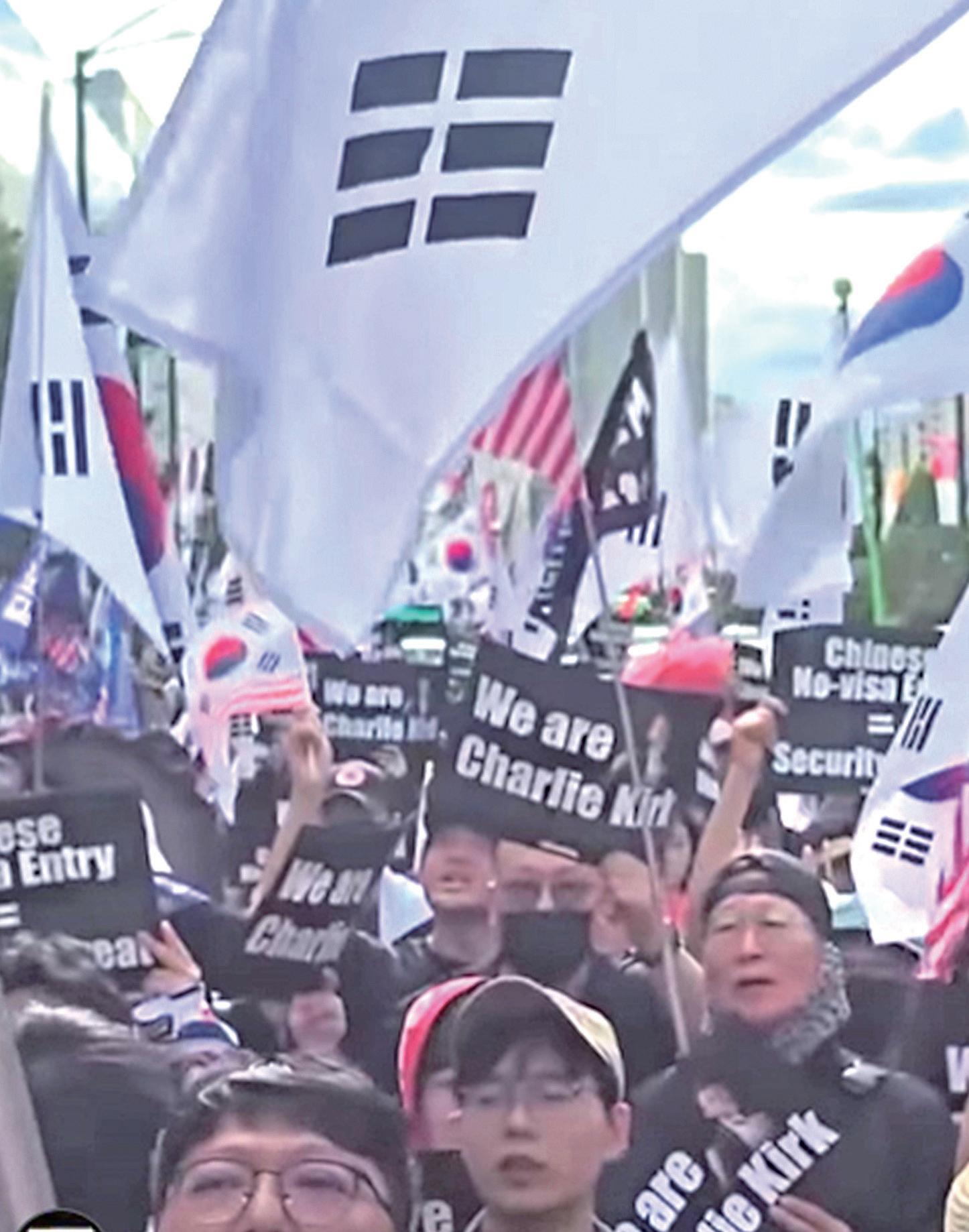 13 日,韓國首爾有數千民眾走上 街頭集會遊行,網傳影片顯示,遊行 者手拿韓國國旗、美國國旗,以及柯 克的照片,齊聲高呼:「我們都是柯 克。」 遊行隊伍中,不少人高舉「捍衛