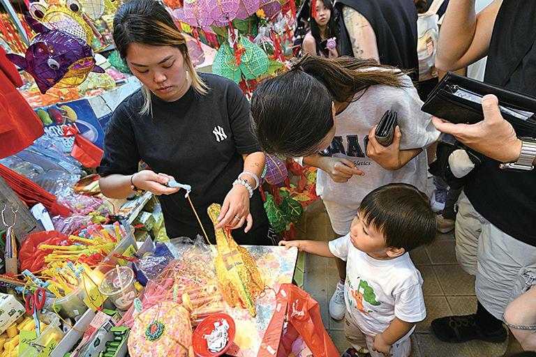 多款燈籠提供,包括球型、兔子、蓮 花、金魚、楊桃等經典造型,亦有卡 通燈籠。資深紮作師傅冒卓褀表示, 部份燈籠上會有字句,希望帶出人月 兩團圓、注重家庭的文化觀念。◇