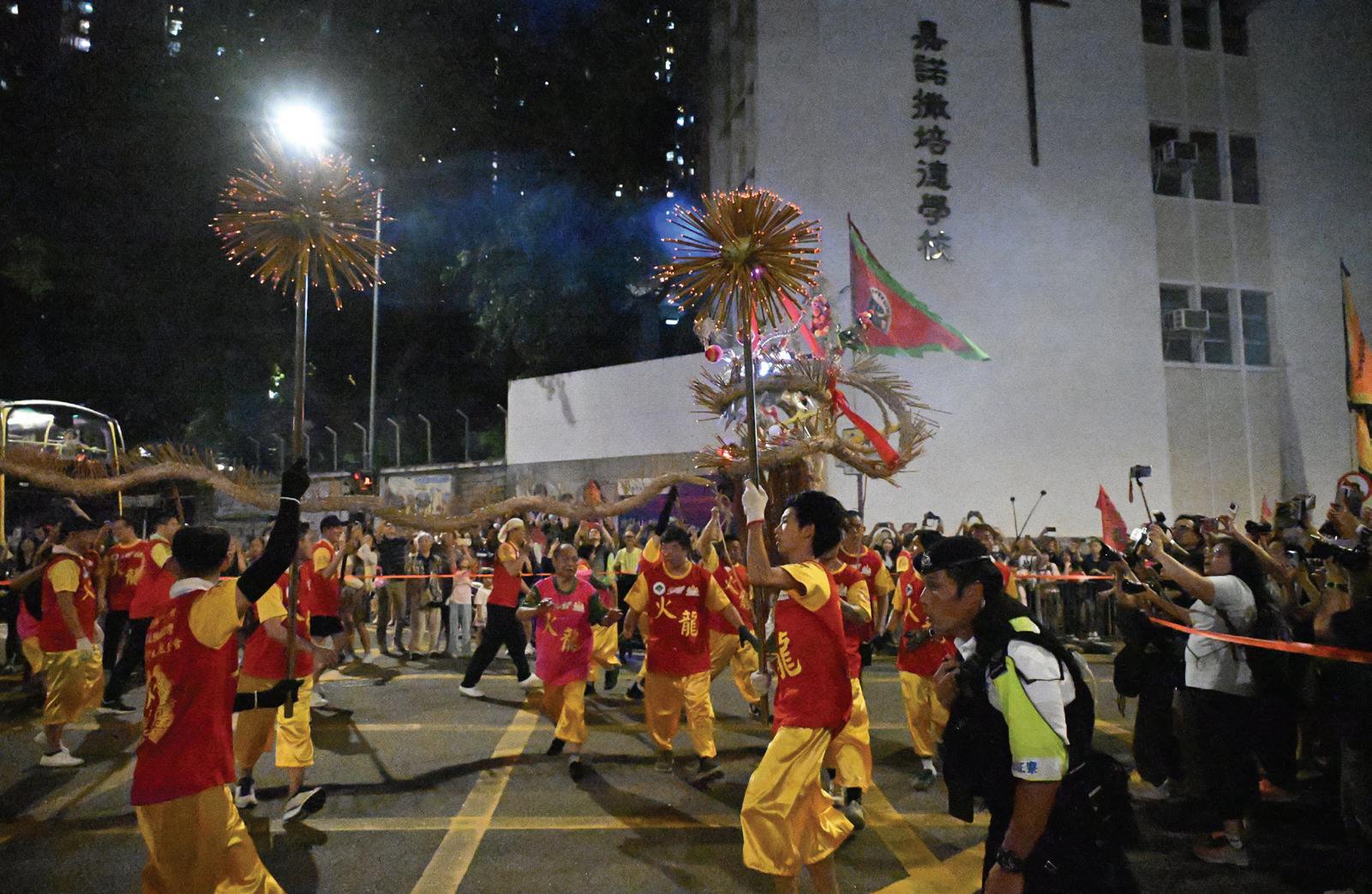 象山邨 6 日晚再擺出燈籠陣。 薄扶林村舉行舞火龍