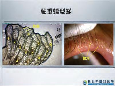 王孟祺曾治療一位中年女性,她的眼睛經常 充血、發紅、發癢,並且分泌物多又乾燥,檢查 時發現眼瞼上充滿了髒污,經顯微鏡採樣檢查後 發現,一根睫毛的根部竟然長了十一隻蠕型蟎, 旁邊還有許多幼蟲。經過徹底清潔治療,結合每 天使用潔眼片擦拭後,這種可怕的狀況才緩解。