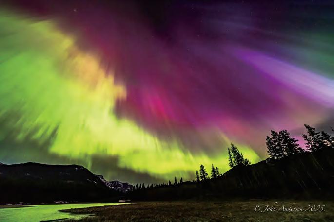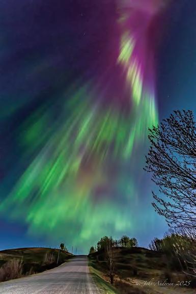 加拿大卡加利攝影師 Auroras 約翰安德松居住在加拿大卡加 利市,從事石油行業地質工作。通 常情況下,在卡加利市區範圍內, 很難看到極光(北極光),並且大 多呈綠色。他會尋找城鎮北邊更黑 暗的鄉村景色。他的攝影作品展示 了粉色、紫色和黃色,這些都表明 存在強烈的磁擾動。