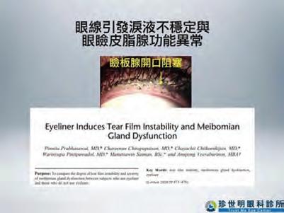 王孟祺進一步說明,化妝品阻塞瞼板腺會導 致淚液油脂分泌異常,尤其畫內眼線時,位置接 近瞼板腺開口,長期阻塞會使瞼板腺逐漸萎縮; 隨著年齡增長,缺油性的乾眼症也會更嚴重,因 為瞼板腺分泌的油脂能減緩淚水蒸發。