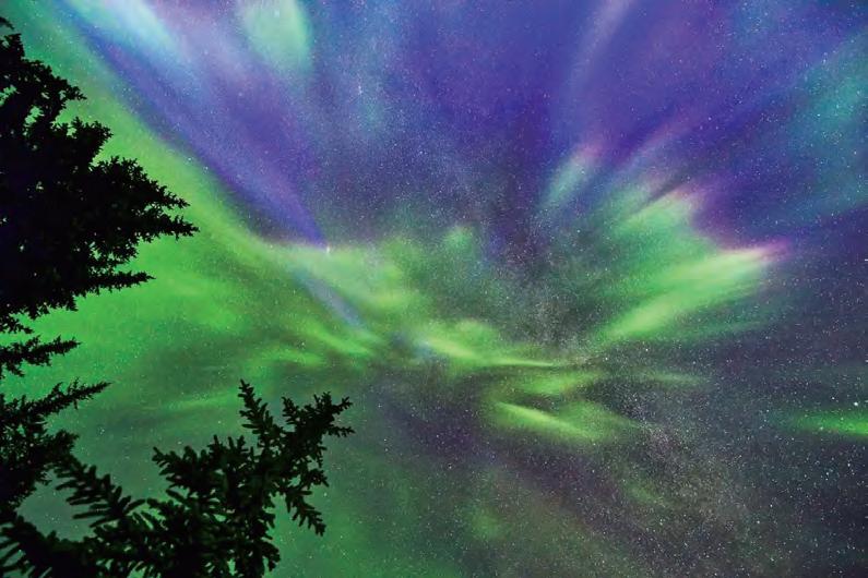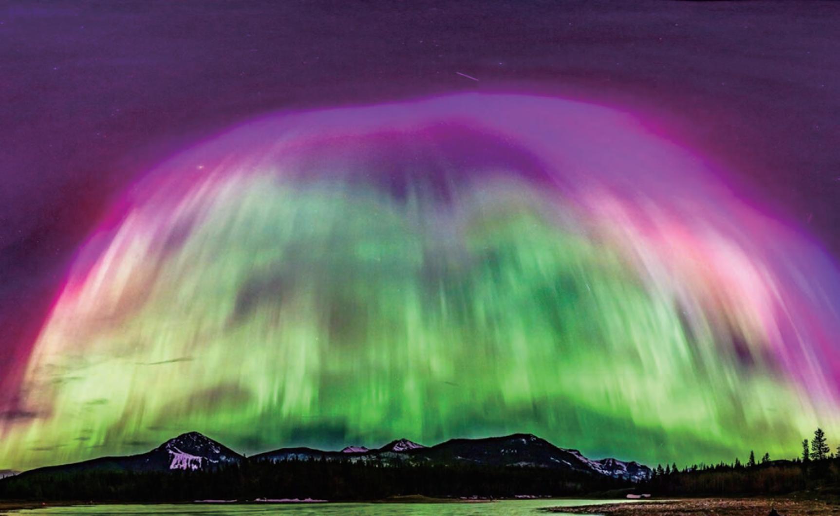北極光出現在最南至熱帶的地 方,據說照亮夜空如此明亮,以至於 人們能借光閱讀報紙。它們散發出鮮 明的深紅色,以及紫色、綠色和黃色 的色調。