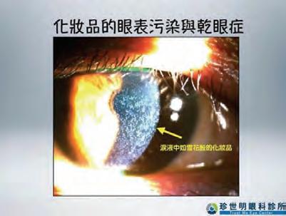 「一位上班族女性患者,抱怨乾眼症越來 越嚴重,而且視力也常常像一層薄膜糊住 一樣。經顯微鏡檢查,赫然發現整個眼睛 表面都覆蓋著如雪花般的化妝品粉末。經 過圖像說明後,患者才警覺要留意化妝的 方式,症狀明顯改善。」