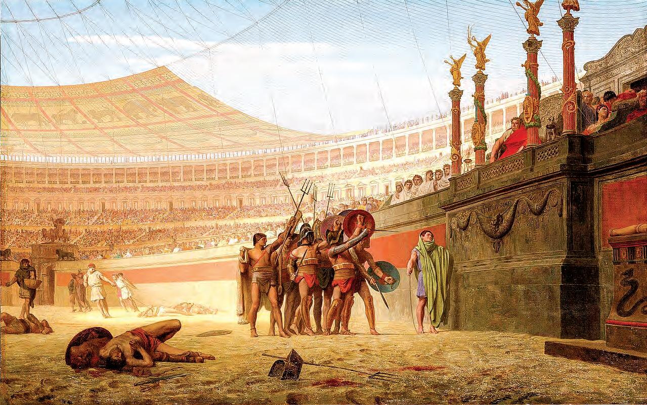 這幅畫的遠景打開了一個廣闊的建 築視野,讓人聯想起現代足球場,裏面 擠滿了觀眾,但相較巨大的橢圓形看 台,人群只是一小部份。身為觀畫者的 我們站在一樓欣賞,前方就是向帝王致 敬的角鬥士,距離近到可看見體態笨重 的帝王表情輕蔑,以及角鬥士金光閃閃 的盔甲。但他們或許不久就會像躺在我 們面前沙子裏的那些人一樣沾滿血跡。