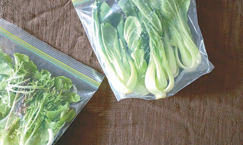 ● 葉菜類一般適合冷藏保 存,像是口感鮮嫩的葉菜類(例 如:莧菜、生菜、油麥菜、茼 蒿⋯⋯),它們的保存期最多只 有 10 天,而且是在妥善保存的情 況下。不過,鮮嫩的定義因人而 異。