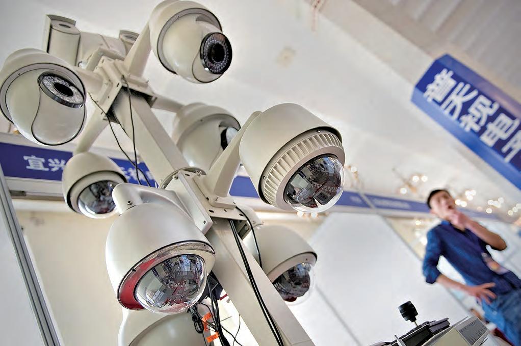 圖為一名中國男子站立在展示的監控鏡頭旁。(PHILIPPE LOPEZ/AFP/Getty Images)