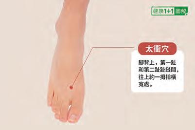 太衝穴(LR3)是肝經上的重要穴位,有助 於調節肝功能,可以緩解壓力與焦慮,能夠舒緩 神經系統,緩解煩躁,恢復情緒平衡。