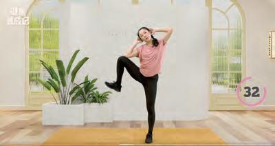 6.側彎捲腹 雙手抬起放在頭側,一腳向旁邊抬起,膝蓋 屈曲上提接近同側手肘。