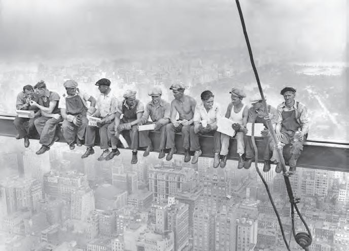 在經濟蕭條時,這項建築群的修 建任務為紐約就業市場帶來了一絲活 力,能通過努力與汗水換來的報酬是 那麼令人踏實,對於生活似乎又有了 一線希望。《摩天樓上的午餐》(Lunch atop a Skyscraper)拍攝於 1932 年, 黑白照片記錄下了 11 名建築工人坐在 兩百米高空中的鋼鐵橫樑上悠閒吃午 餐的場景,他們放鬆的姿態和身下百 米高空形成了強烈的視覺張力,雖然 這張照片並非隨機抓拍,而是大樓的 宣傳活動攝影,但工人們長期高空工 作培養出的鎮定自若是無法一蹴而就 的。這張照片也成為了美國歷史的一 部份,記錄了那個黑暗與光明交織的 年代。