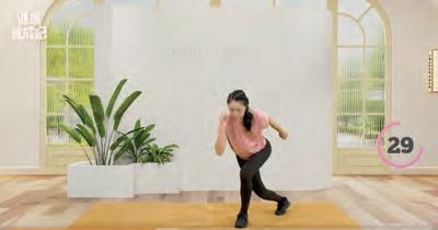 8.髖鉸鏈左 左腳向前邁出,重心在前方左腳處,雙手舉 過頭頂。左腳向後點地,屈膝時將臀部往後推,