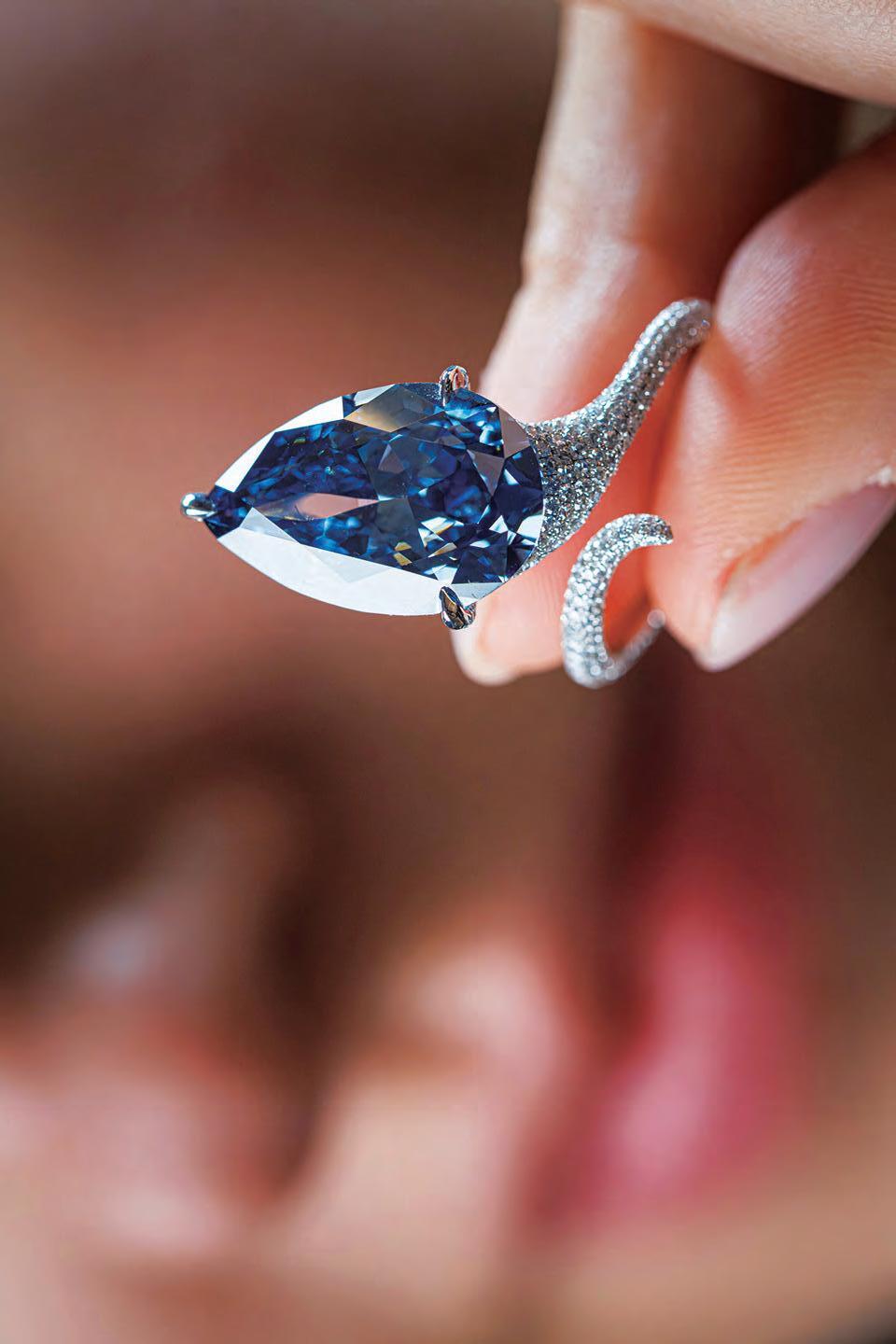 彩色鑽石一直是拍賣場上的寵 兒,尤其是大克拉、高級別的藍鑽和 粉鑽,屢屢拍出高價。彩鑽的價值取 決於顏色、淨度及重量。能達到 GIA 豔彩藍(Fancy Vivid Blue)級別的鑽 石溢價最高,其次是濃彩藍(Fancy Intense),隨著淨度和重量的增長,價 格會呈幾何級上升。◇