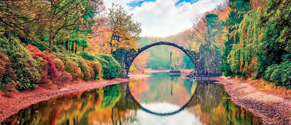 拉科茨橋(Rakotzbrucke)位於德國薩克森州的卡羅 湖公園內。橋身擁有令人驚歎的半圓形結構,與水中倒 影構成了一個近乎完美的圓環,再配合周圍詩情畫意的 景致,令人恍若進入了一個虛幻的空間。