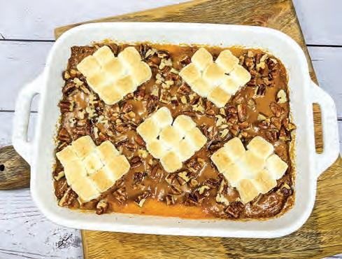 美國許多家庭的感恩節餐桌,都會有一道南方風 格的紅薯砂鍋配菜。傳統南方風格紅薯砂鍋的基 底,是紅薯泥混合牛油、雞蛋、牛奶、糖和香草 精,表面澆頭(配料)以山核桃碎與棕糖、牛油 烘烤而成。