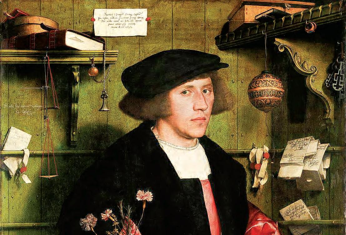 小漢斯霍爾班於 1532 年所繪的商人喬治吉瑟(Georg Gisze)肖像畫(局部)。(公有領域)